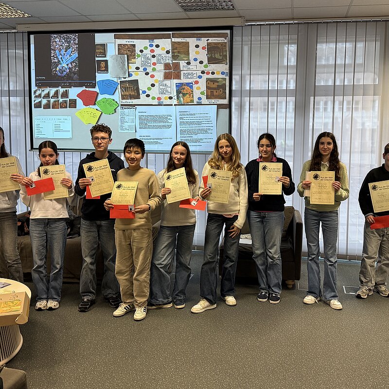 Am Mittwoch dem 11.3.2026 unternahmen wir gemeinsam mit unserem Lateinlehrer Herrn Meuser einen Ausflug zum Preisverleihungstag in Düsseldorf. Ursprünglich war die Anreise mit der Deutschen Bahn geplant, doch aufgrund von Zugausfällen fuhren wir stattdessen mit dem Auto. Während der Fahrt hörten wir uns einen lateinischen Vortrag über die Aussprache des Lateinischen sowie eine Erzählung über Ciceros Leben aus der Sicht seines Sekretärs Tiro an, was die Fahrt interessant und lehrreich gestaltete.
